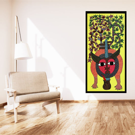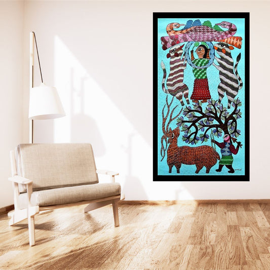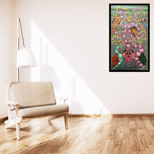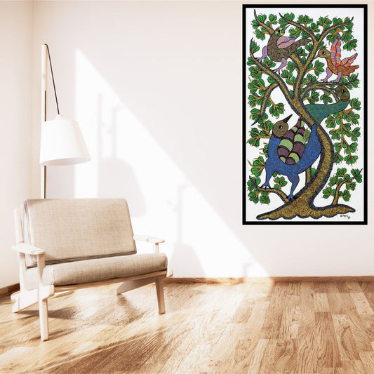 Original Handmade Tribal Gond Painting Of Animals Taking Shelter Under A Tree