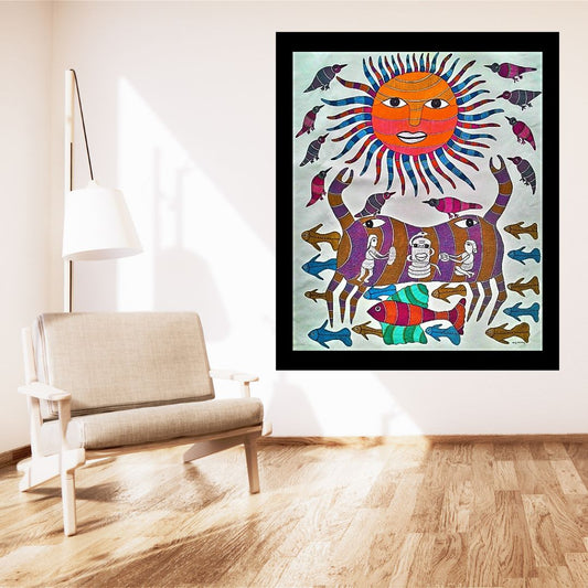 Original Handmade Tribal Gond Painting Of Gods Creation With Lines And Dots