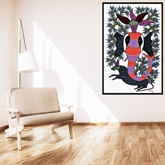 Original Handmade Tribal Gond Painting Illustrating Snake And Mongoose Fight